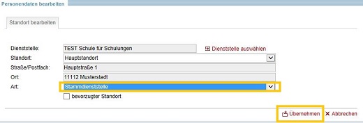 Kennzeichnen Sie Ihre hauptsächliche (aktuelle) Dienststellenzuordnung als bevorzugten Standort und schließen Sie Ihre Eingaben mit ÜBERNEHMEN ab.