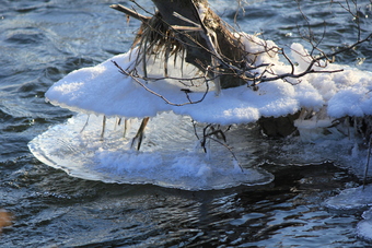 Das Bild zeigt Eisschichten an einem Baumstamm im Fluss. Die übereinander liegenden Eisschichten zeigen, dass der Fluss in den letzten Tagen höhere Wasserstände hatte. Das Bild ist unter CC0 lizenziert und kann somit frei verwendet werden.