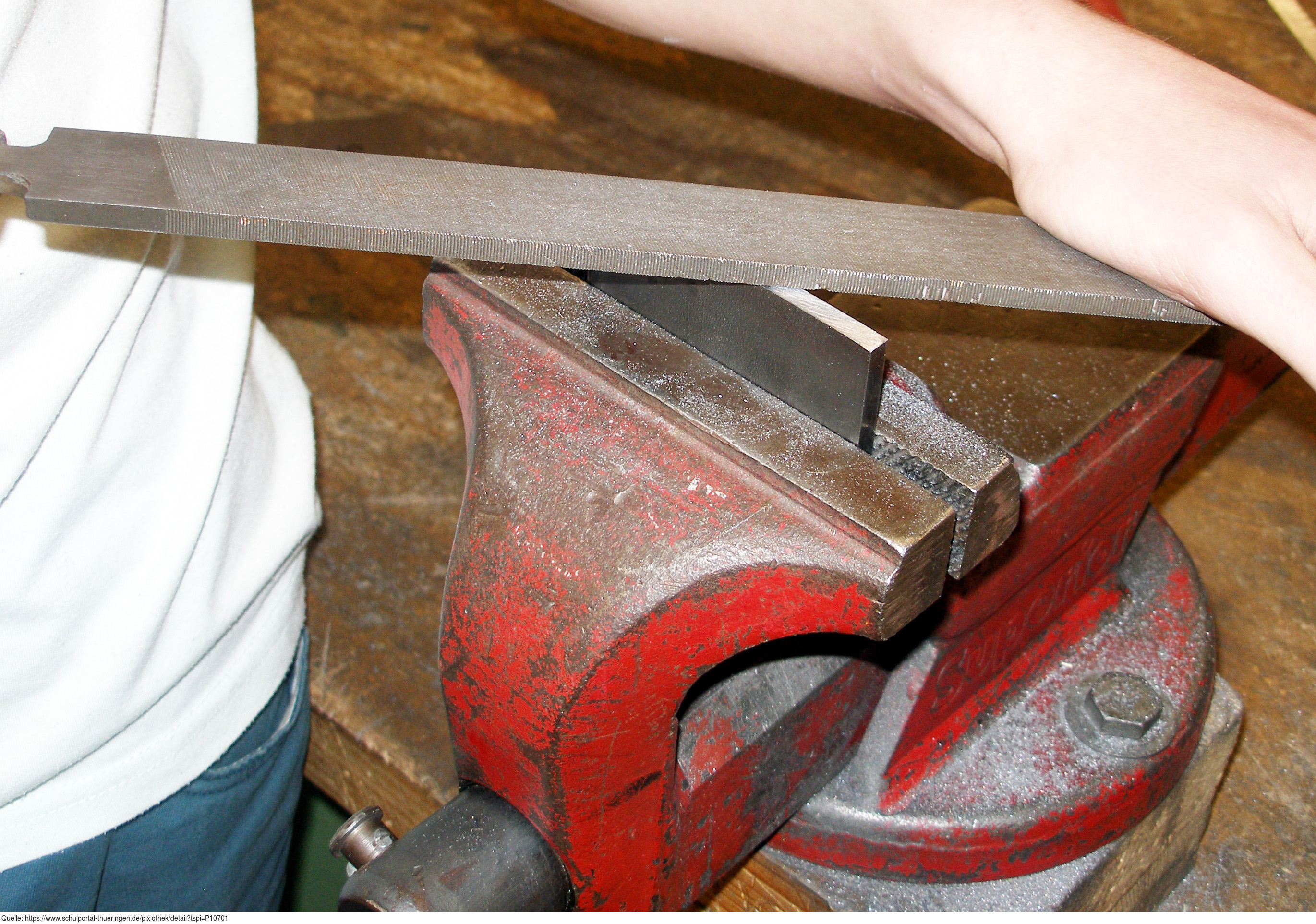 Das Bild gehört zur Serie "Werkzeuge". Es zeigt die Verwendung einer Flachfeile beim Bearbeiten einer im Schraubstock eingespannten Metallplatte. Das Bild ist unter CC0 lizenziert und kann somit frei verwendet werden.
