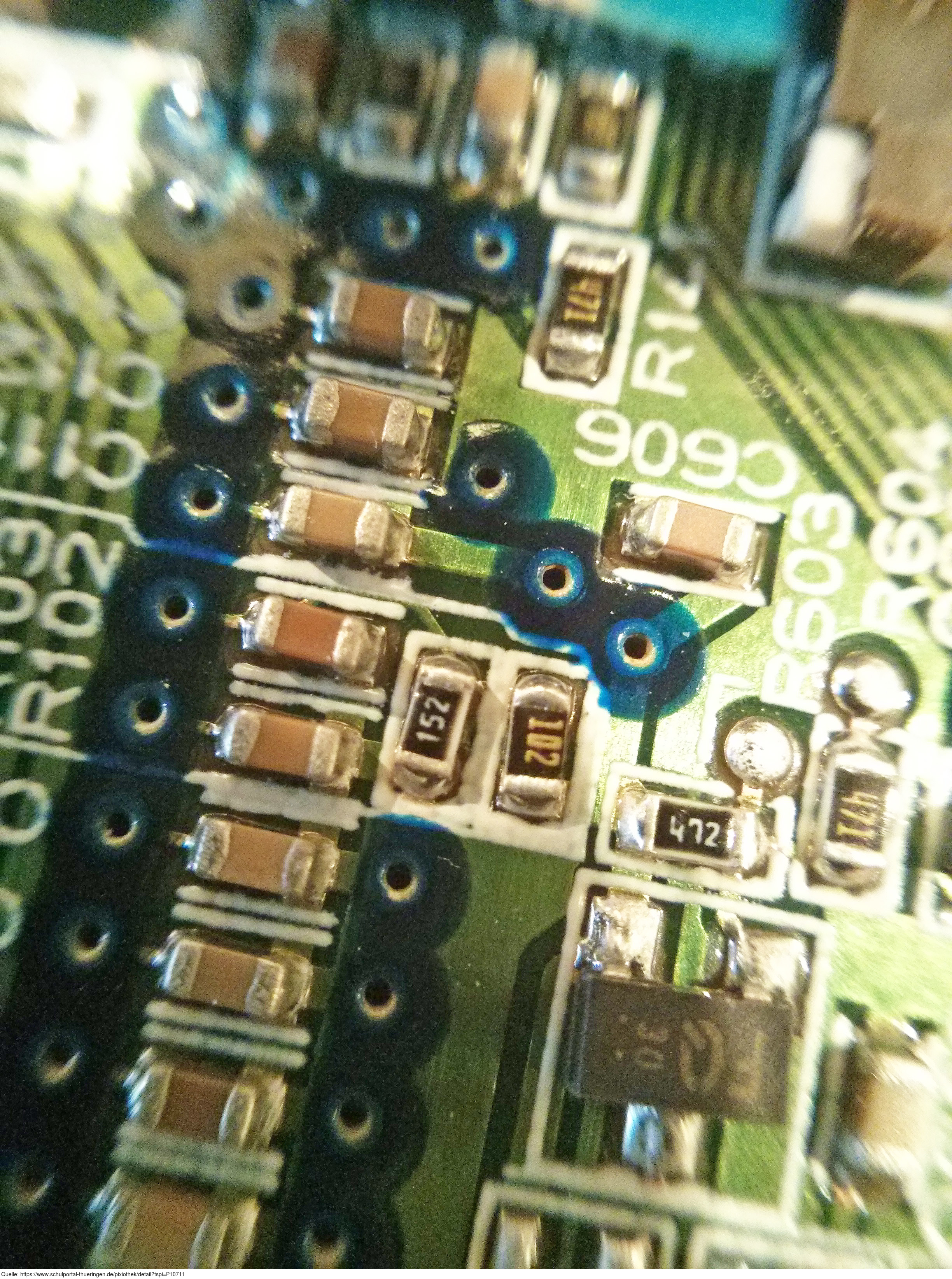 Das Foto gehört zur Serie "Elektronische Bauelemente". Es zeigt eine Leiterplatte, auch Platine oder gedruckte Schaltung genannt. Das Bild ist unter CC0 lizenziert und kann somit frei verwendet werden.