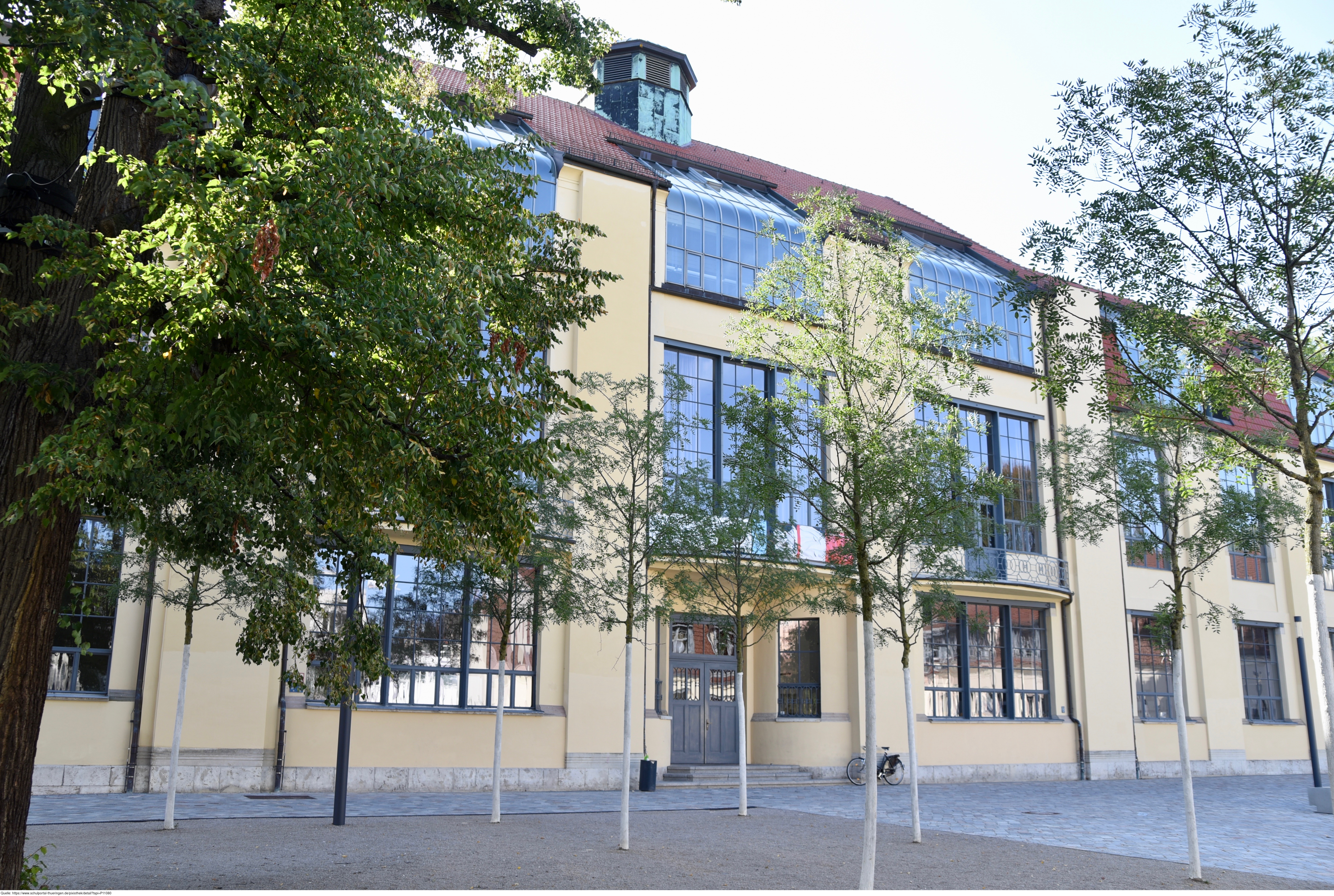 Das Foto gehört zur Serie "Bauhaus in Weimar". Im Zeitrahmen 1904 bis 1911 wurde nach Plänen Henry van de Veldes die Kunstgewerbeschule und später der Hochschulbau für Bildende Kunst in Weimar errichtet (heutiges Hauptgebäude der Bauhaus-Universität Weimar). Es ist eines der bedeutendsten Kunstschulbauten der Jahrhundertwende und war 1919 Gründungsort des von Walter Gropius ins Leben gerufene Staatlichen Bauhauses. Nach Art und Konzeption war es in dieser Zeit etwas völlig Neues, da das Bauhaus eine Zusammenführung von Kunst und Handwerk darstellte. Es gelten die Nutzungsbedingungen der Mediothek und Pixiothek.