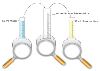 Das Bild gehört zur Serie "Chemie Grafiken". Es veranschaulicht ein Experiment zur Volumenbetrachtung beim Mischen von Aklohol und Wasser. Die Grafik kann zur Gestaltung von Arbeitsblättern verwendet werden. Das Bild ist unter CC0 lizenziert und kann somit frei verwendet werden.