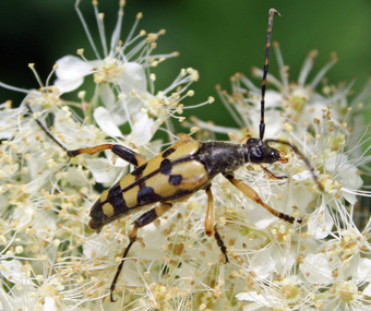 Das Foto hehört zur Serie "Bockkäfer". Es zeigt einen Gefleckten Schmalbock (Rutpela maculata) einen Käfer aus der Familie der Bockkäfer. Es gelten die Nutzungsbedingungen der Mediothek und Pixiothek.