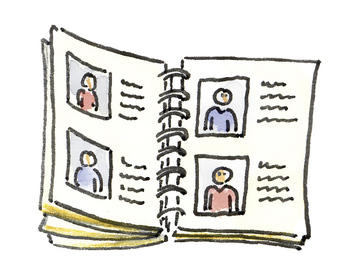 Das Bild zeigt ein gezeichnetes Notizbuch mit Bildern und Adressen. Es gelten die Nutzungsbedingungen der Mediothek und Pixiothek.