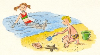 Das Bild zeigt gezeichnete Kinder beim Baden und Spielen am Strand. Es gelten die Nutzungsbedingungen der Mediothek und Pixiothek.