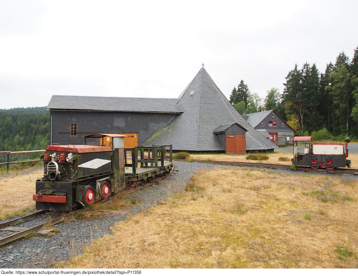 Das Bild gehört zur Serie "Thüringischer Schieferpark Lehesten". Es zeigt die Göpelschachtanlage sowie ehemalige Werksbahnen. Es gelten die Nutzungsbedingungen der Mediothek und Pixiothek.
