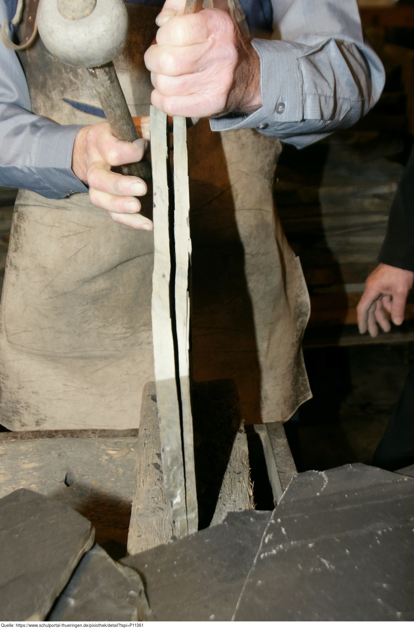 Das Bild gehört zur Serie "Thüringischer Schieferpark Lehesten". Es zeigt die Demonstration des Spaltens von Schieferdurch einen ehemaligen Mitarbeiters. Es gelten die Nutzungsbedingungen der Mediothek und Pixiothek.