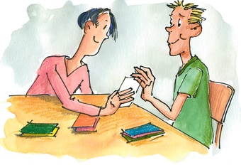 Das Bild gehört zur Serie "Lernformen". Es zeigt ein gezeichnetes Symbolbild für die Lernform Partnerarbeit. Es gelten die Nutzungsbedingungen der Mediothek und Pixiothek.