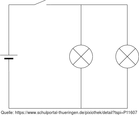 Das Bild gehört zur Serie "Elektrische Schaltungen". Es zeigt den Schaltplan einer Parallelschaltung mit Spannungsquelle (Batterie), Schalter und zwei Verbrauchern (Glühlampen). In dieser Version wurden die Verbindungsknoten nicht eingezeichnet. Das Bild ist unter CC0 lizenziert und kann somit frei verwendet werden.