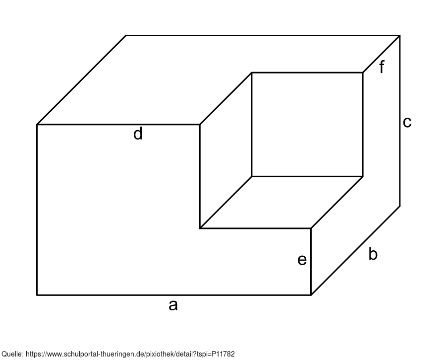 Das Bild gehört zur Serie "Geometrie Körper". Es zeigt einen Quader, bei dem an einer Ecke ein quaderförmiges Stück herausgetrennt wurde. Bei Vorgabe von Maßangaben für die bezeichneten Seiten kann das Volumen des Restkörpers berechnet werden. Das Bild ist unter CC0 lizenziert und kann somit frei verwendet werden.