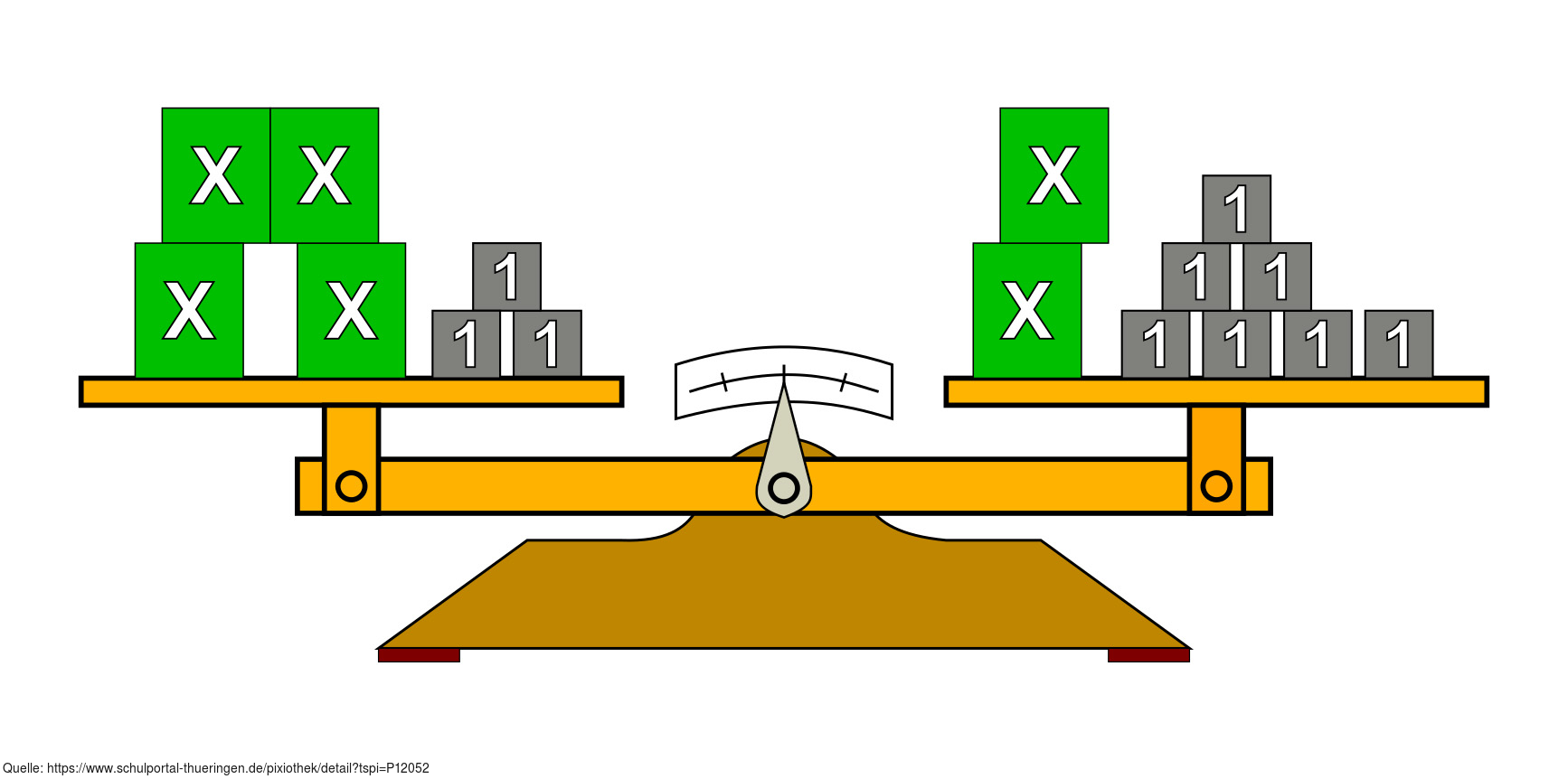 Das Bild gehört zur Serie "Mathematik, Gleichungen". Es veranschaulicht die Lösung einer linearen Gleichung durch Äquivalenzumformung mit dem Bild einer Waage. Zur Gleichung 22 veranschaulichen die Bilder 22-1 bis 22-4 die Umformungsschritte. Das Bild ist unter CC0 lizenziert und kann somit frei verwendet werden.