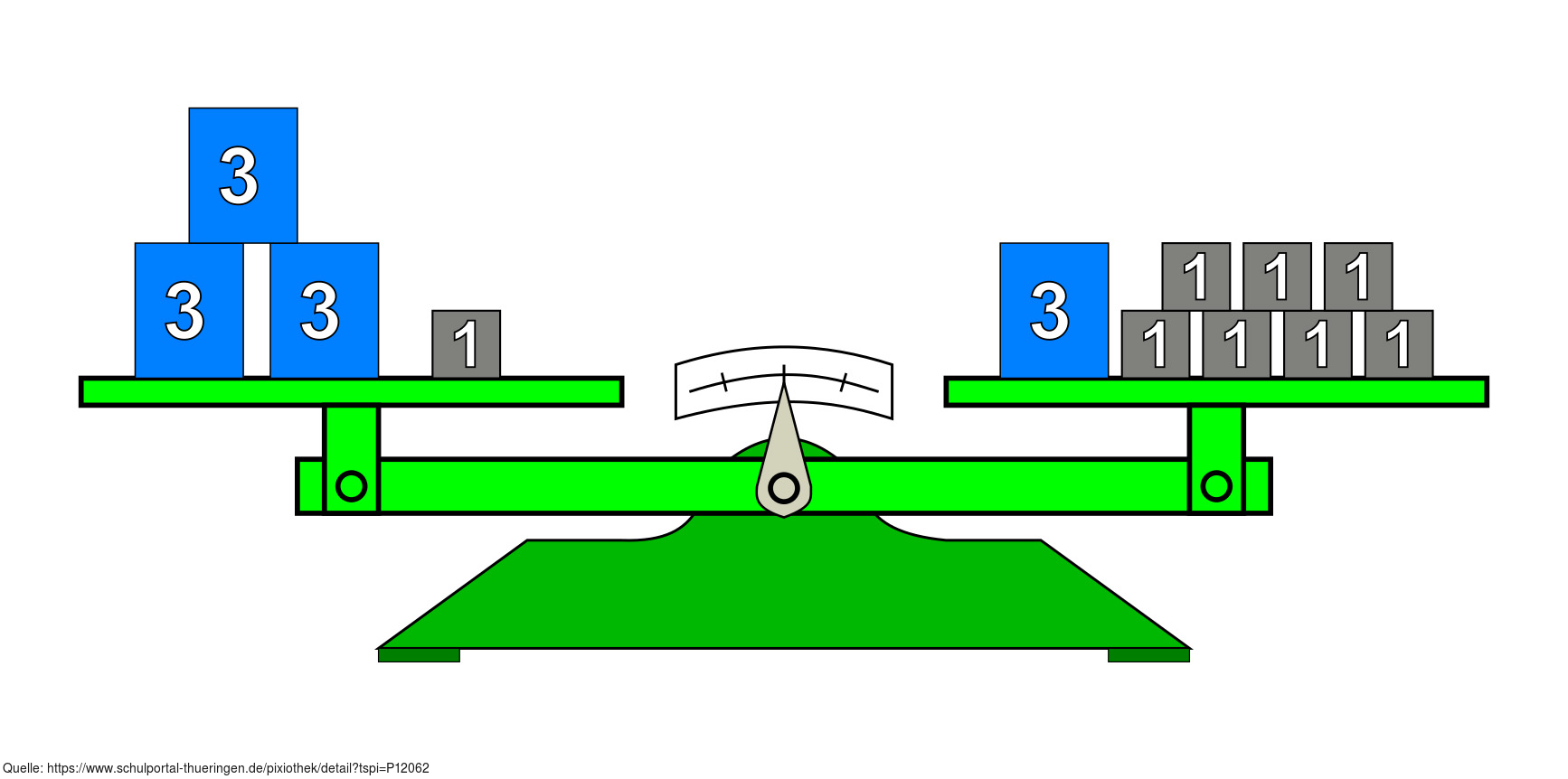 Das Bild gehört zur Serie "Mathematik, Gleichungen". Es veranschaulicht die Probe für die Lösung der linearen Gleichung 21. Durch Einsetzen der gefundenen Lösung für die Variable x entsteht im Bild auf beiden Seiten der Waage die gleiche Summe. Das Bild ist unter CC0 lizenziert und kann somit frei verwendet werden.