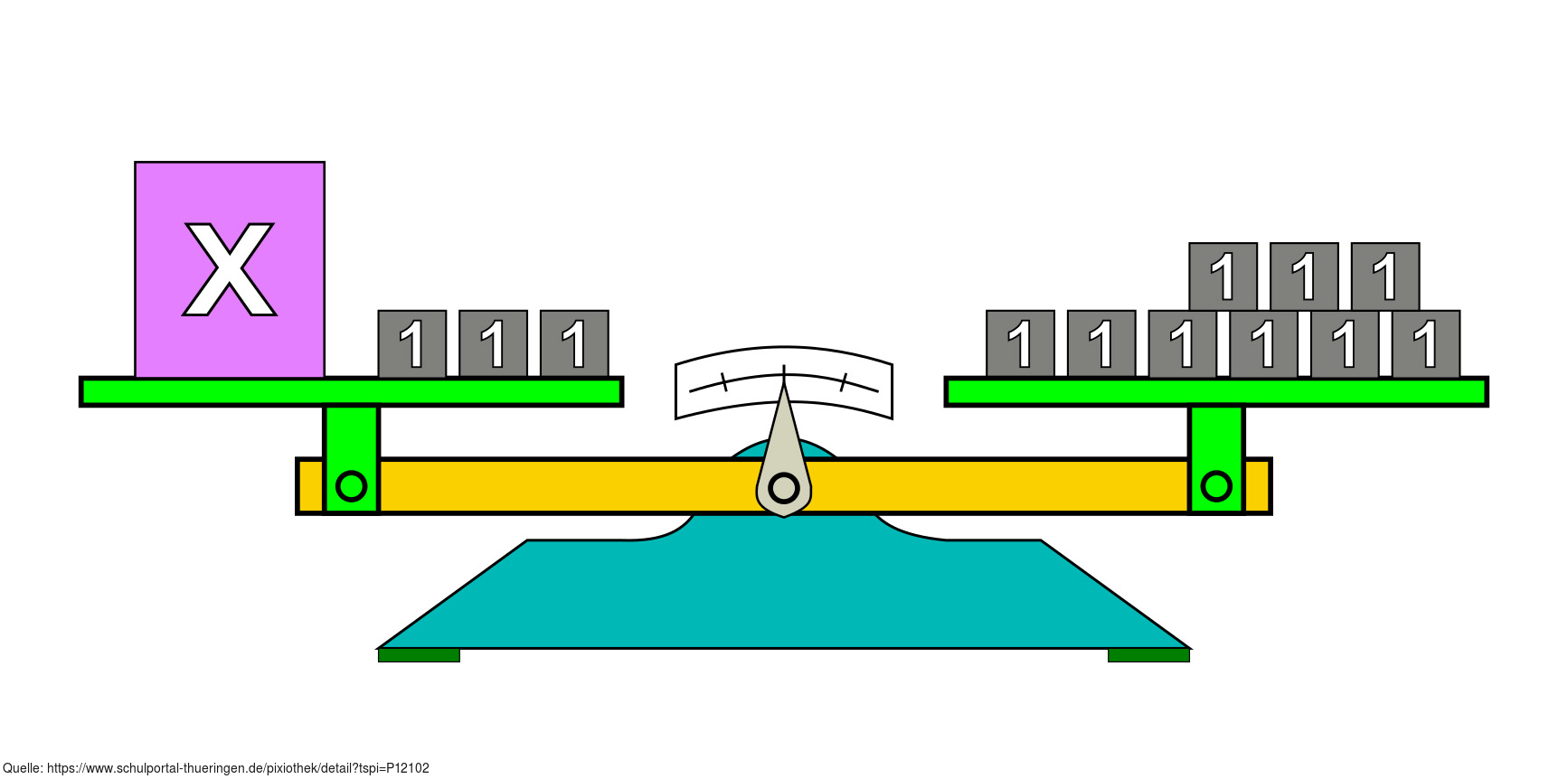 Das Bild gehört zur Serie "Mathematik, Gleichungen". Es veranschaulicht eine linearen Gleichung durch Körper auf einer Waage. Das Bild ist unter CC0 lizenziert und kann somit frei verwendet werden.