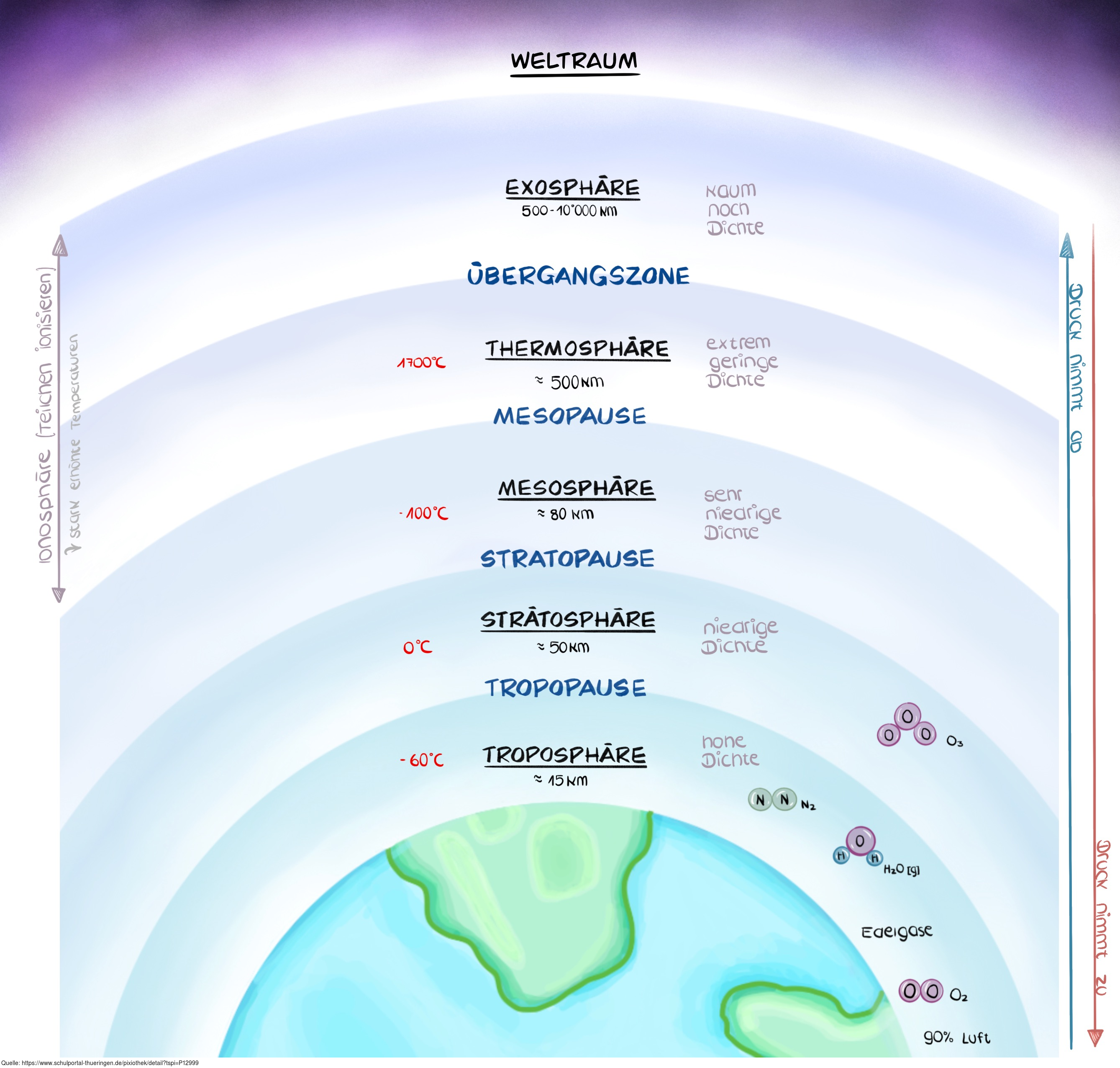 Die Zeichnung verdeutlicht den Aufbau der Atmosphäre. Es gelten die Nutzungsbedingungen der Mediothek und Pixiothek.