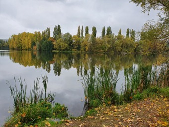 Bäume im Herbstlaub spiegeln sich im See. Es gelten die Nutzungsbedingungen der Mediothek und Pixiothek.