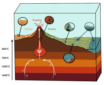 Die Abbildung verdeutlicht die Entstehung von Diamantlagerstätten. Es gelten die Nutzungsbedingungen der Mediothek und Pixiothek.