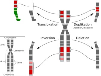 Darstellung von vier Formen der Chromosomenmutation (Duplikation, Deletion, Inversion, Translokation).
