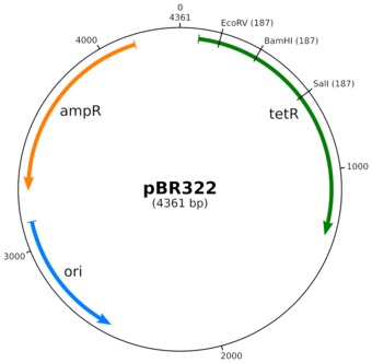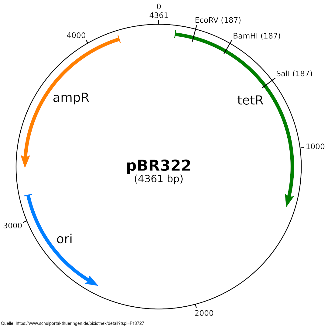 Plasmidkarte von pBR322 zur Bakterien-Klonierung mittels 2er Resistenzen (ampR, tetR).