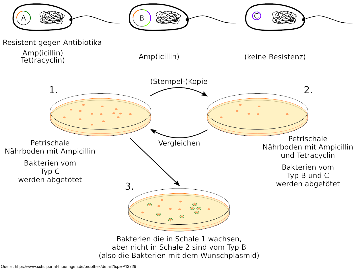 Selektion der korrekten genetisch veränderten Bakterien mittels zweier Antibiotika (Amp, Tet).