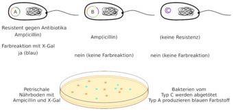 Selektion der korrekten genetisch veränderten Bakterien mittels zweier Antibiotika (Amp, X-Gal).