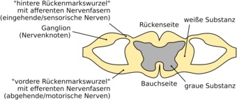 beschrifteter Querschnitt durch das Rückenmark. Es gelten die Nutzungsbedingungen der Mediothek und Pixiothek. Auf http://unterricht.petzinger.net/biochdropbox.html auch als svg und in CC-BY verfügbar.