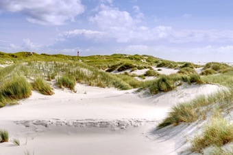Das Bild zeigt eine Dünenlandschaft auf Amrum. Im Hintergrund ist ein Leuchtturm zu sehen. Das Bild ist unter CC0 lizenziert und kann somit frei verwendet werden.