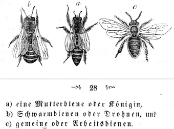 Drohne, Bienenkönigin, Arbeiterbiene (mit Beschriftung)