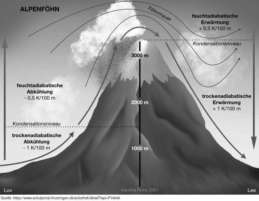 Das Bild gehört zur Serie "Grafische Darstellung Alpenföhn". Das Bild verdeutlicht den Alpenföhn (Föhnwind des Alpenraumes). Bild-Variante: Berg; farbig; unbeschriftet. Es gelten die Nutzungsbedingungen der Mediothek und Pixiothek.