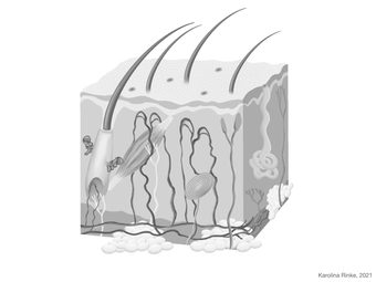 Das Bild gehört zur Serie "Organe des Menschen". Das Bild verdeutlicht den Aufbau der menschlichen Haut. Bild-Variante: s/w; unbeschriftet. Es gelten die Nutzungsbedingungen der Mediothek und Pixiothek.
