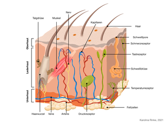 Das Bild gehört zur Serie "Organe des Menschen". Das Bild verdeutlicht den Aufbau der menschlichen Haut. Bild-Variante:farbig; beschriftet. Es gelten die Nutzungsbedingungen der Mediothek und Pixiothek.