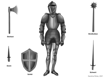 Das Bild zeigt einen Ritter in Rüstung und mit Ausrüstung. Bild-Variante: s/w; unbeschriftet. Es gelten die Nutzungsbedingungen der Mediothek und Pixiothek.