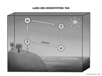 Das Bild gehört zur Serie „Zirkulationssysteme der Erde“. Es verdeutlicht das Land-See-Windsystem der Erde. Bild-Variante: s/w; beschriftet, Tag. Es gelten die Nutzungsbedingungen der Mediothek und Pixiothek.