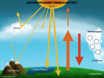 Das Bild verdeutlicht den anthropogenen Treibhauseffekt. Bild-Variante: farbig; teilbeschriftet. Es gelten die Nutzungsbedingungen der Mediothek und Pixiothek.