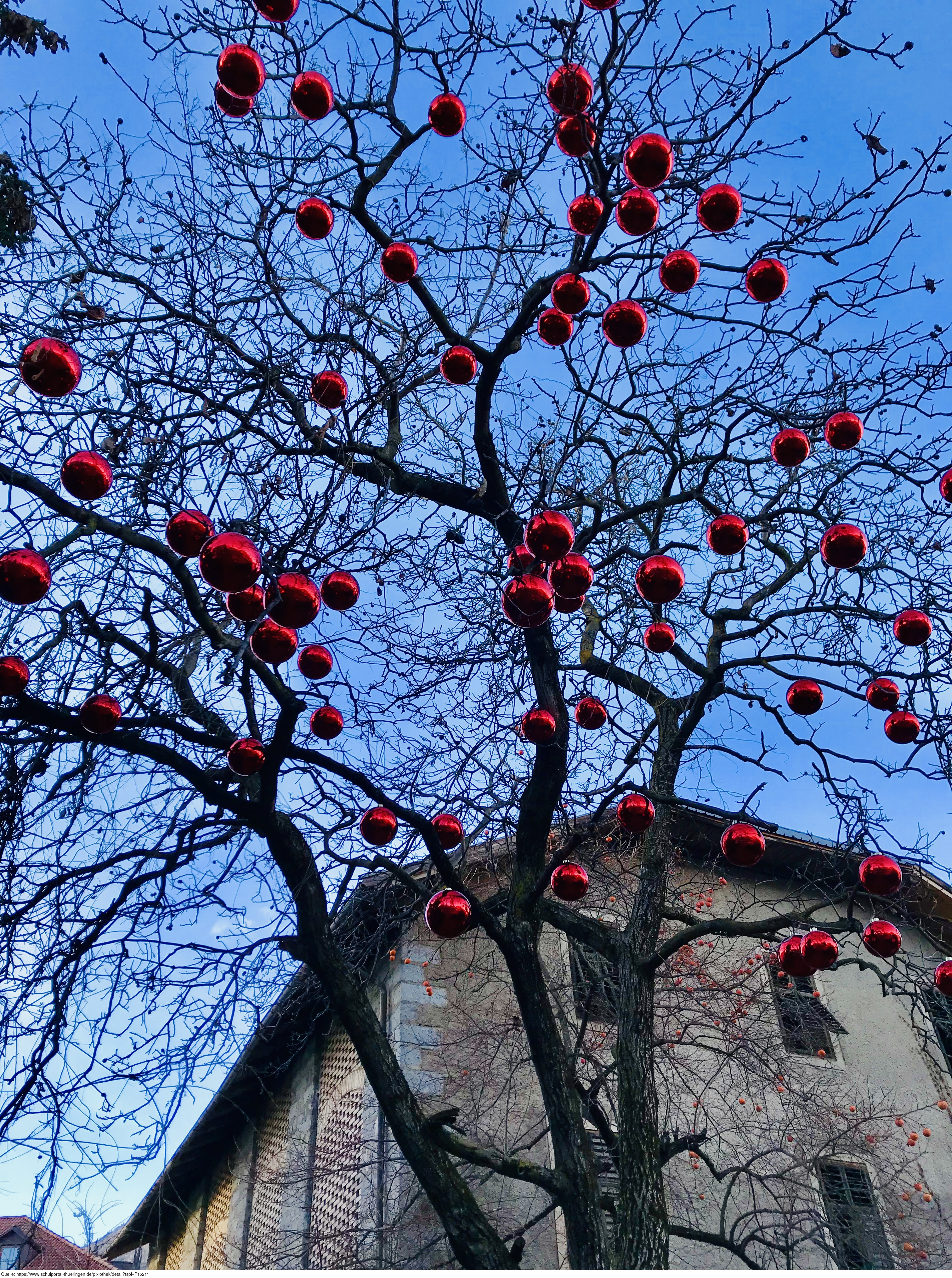 Weihnachtliche Dekoration mit Kugeln an einem Baum. Es gelten die Nutzungsbedingungen der Mediothek und Pixiothek.