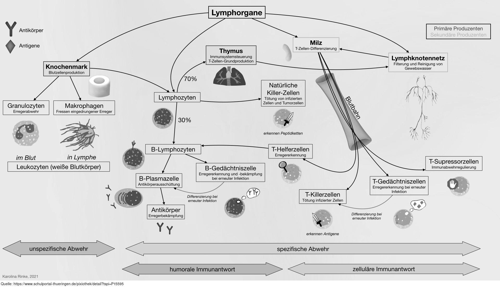 Das Bild verdeutlicht die Wirkungsweise des Immunsystems in einer Übersichtsdarstellung. Variante: s/w; beschriftet; grauer Hintergrund. Es gelten die Nutzungsbedingungen der Mediothek und Pixiothek.