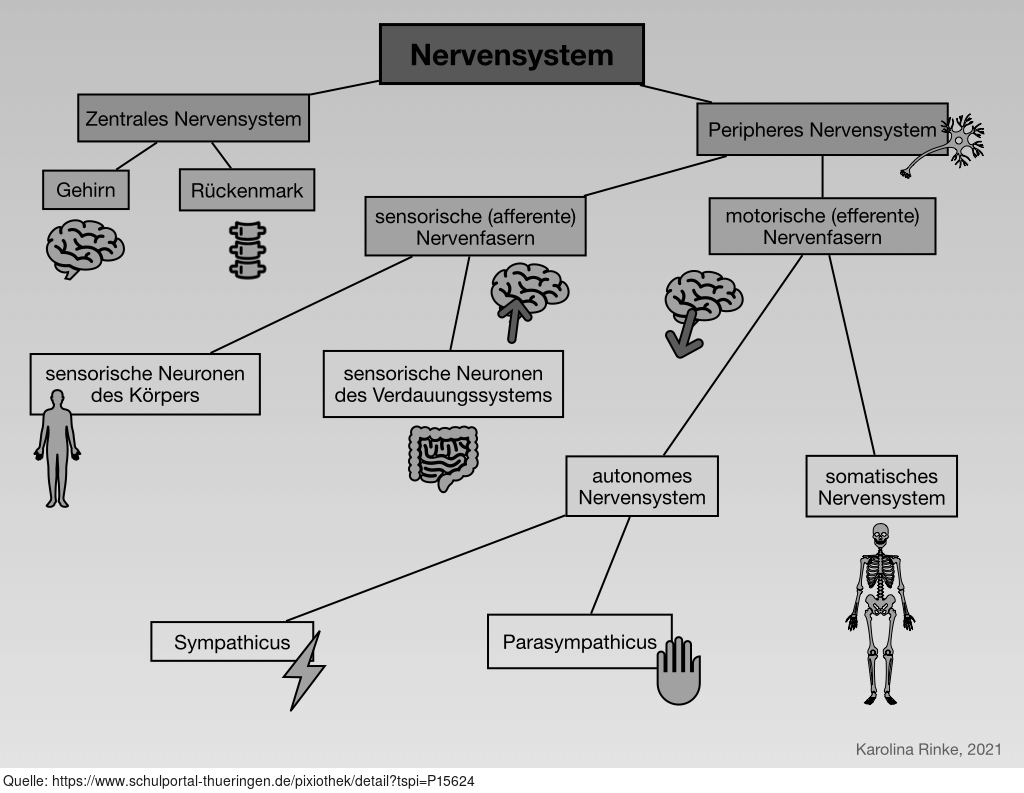 Das Bild verdeutlicht in einer Übersicht das Nervensystem. Variante: s/w; beschriftet; bebildert; grauer Hintergrund. Es gelten die Nutzungsbedingungen der Mediothek und Pixiothek.
