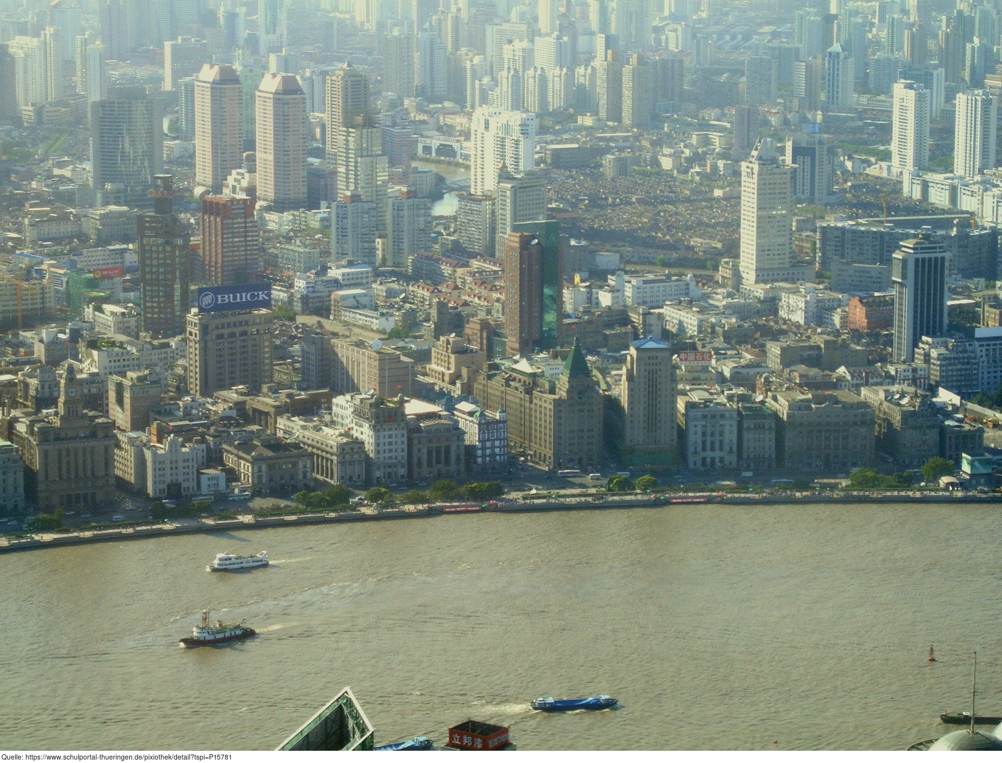 Das Foto gehört zu einer Serie mit 3 Motiven der Stadt Shanghai, aufgenommen im Oktober 2005. Die Fotos liegen jeweils im Original vor (sonniges Wetter, aber dunstig) sowie in einer bearbeiteten Version (Helligkeit herab-, Kontrast heraufgesetzt, Farbtemperatur und -ton verbessert; subjektiver Eindruck). Die Bilder dieser Serie können als Anregung bzw. als Einstieg für das Thema Bildbearbeitung dienen.