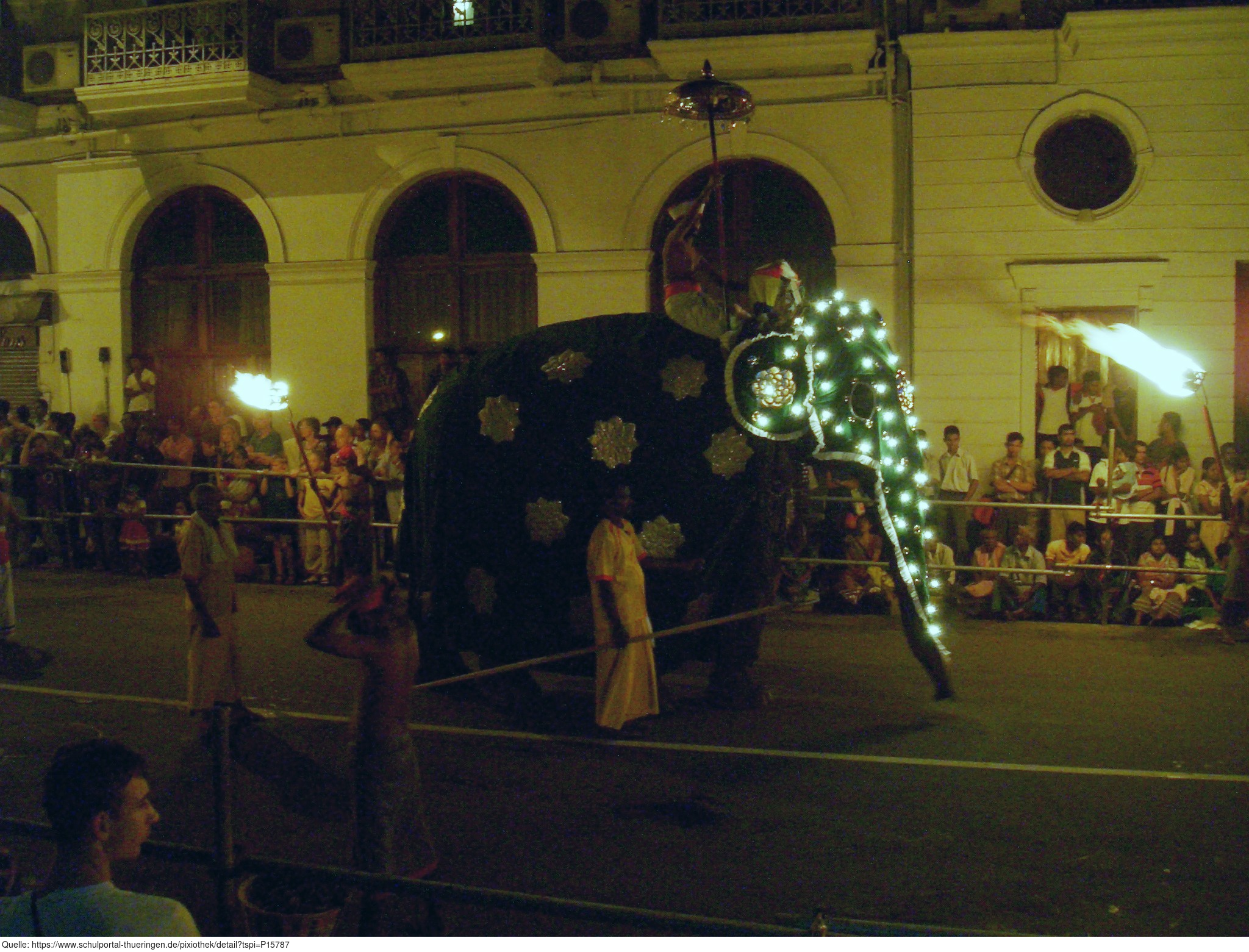 Das Foto ist Teil eines Bildpaares mit dem Motiv eines geschmückten Elefanten, aufgenommen bei der Zahnprozession in Kandy, Sri Lanka, dem Fest Esala Perahera. Im Original ist das Foto zu dunkel und zu farbstichig. In der bearbeiteten Version wurden die Helligkeit herauf- und der Kontrast herabgesetzt sowie die Farbtemperatur und -ton verbessert (subjektiver Eindruck). Das Bildpaar kann als Anregung bzw. als Einstieg für das Thema Bildbearbeitung dienen.