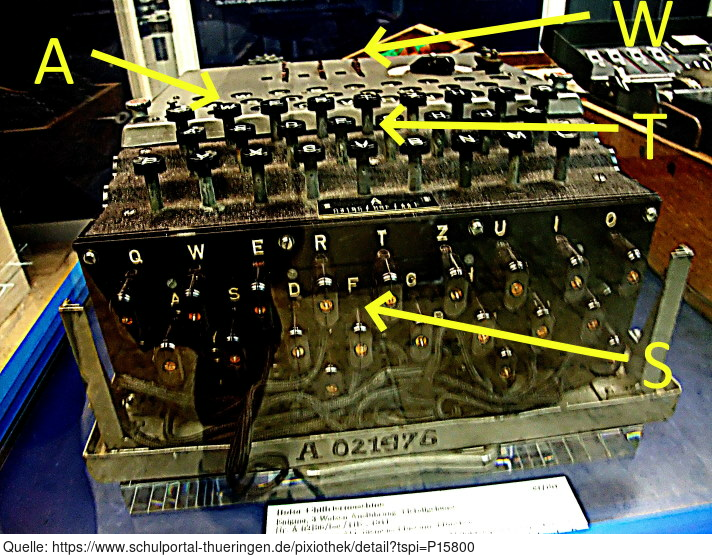 Ansicht der Enigma-Verschlüsselungsmaschine. Es sind folgende Teile beschriftet: T - Tastaturc, A - Anzeige, W - Walzen, S - Steckerfeld.