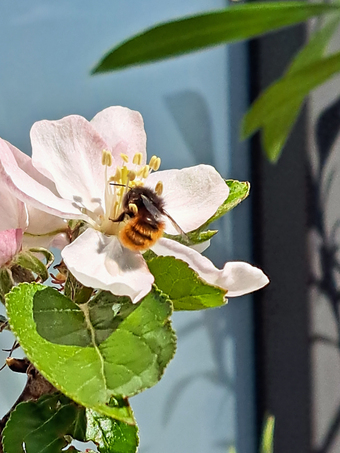Gehörnte Mauerbiene auf einer Apfelblüte