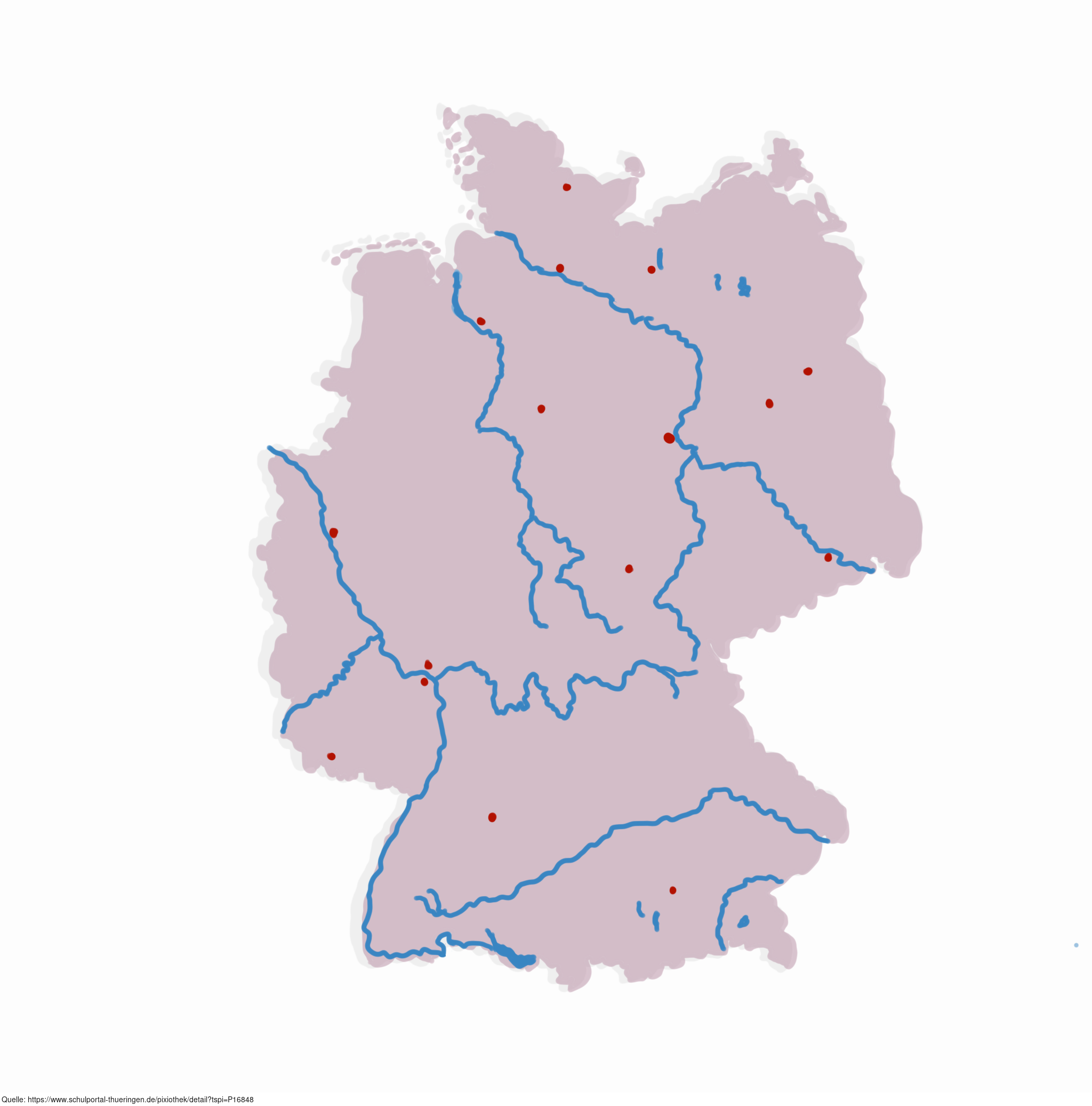 Das Bild zeigt eine stumme Karte von Deutschland mit den wichtigsten großen Flüssen und ausgewählten Großstädten. Das Bild ist unter CC0 lizenziert und kann somit frei verwendet werden.