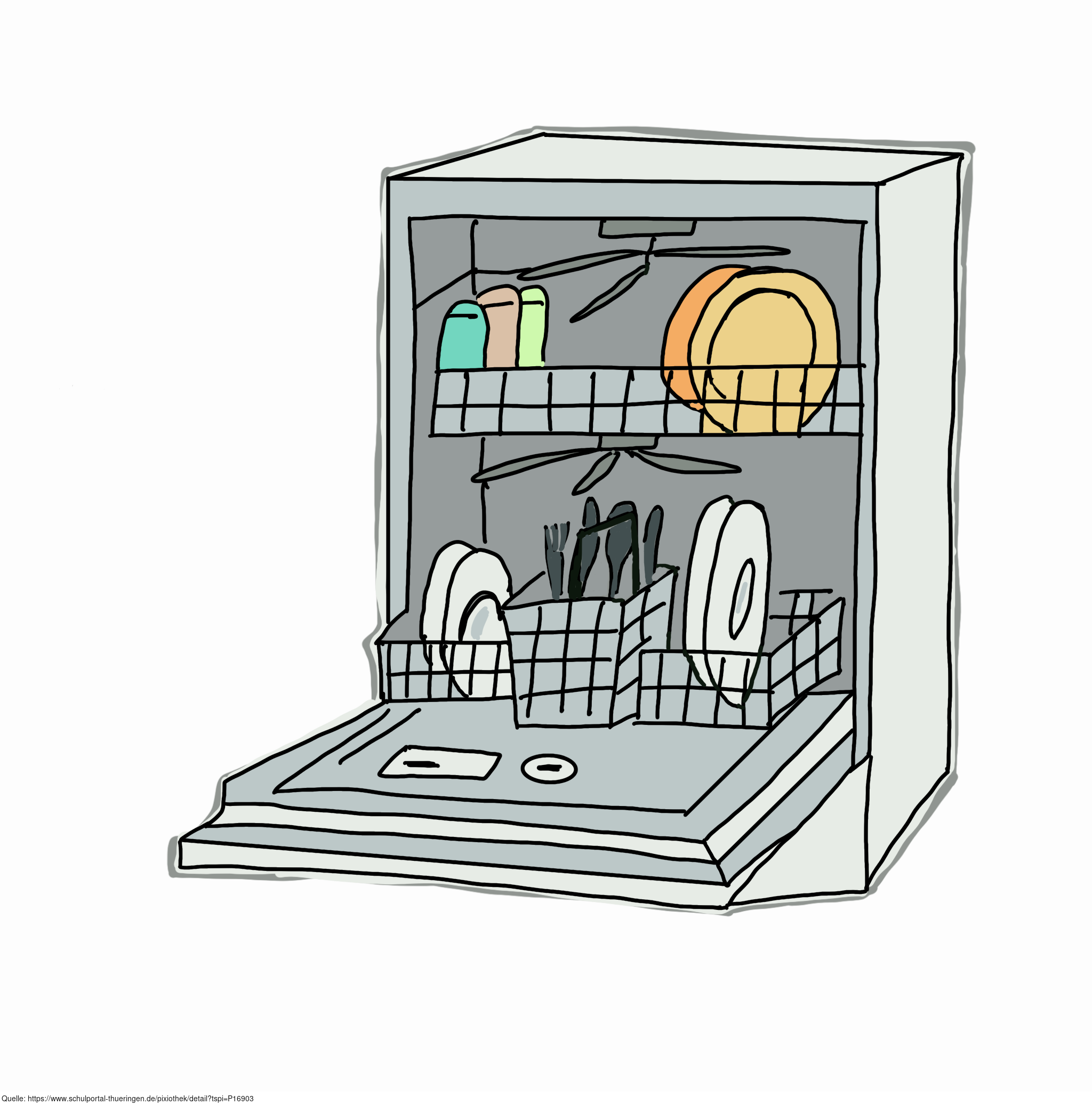 Das Bild zeigt eine gezeichnete Spülmaschine. Das Bild ist unter CC0 lizenziert und kann somit frei verwendet werden.