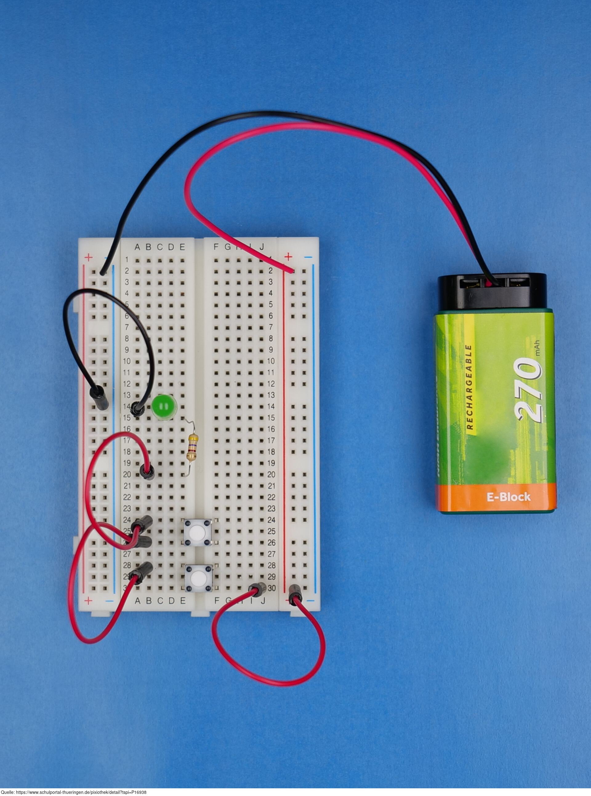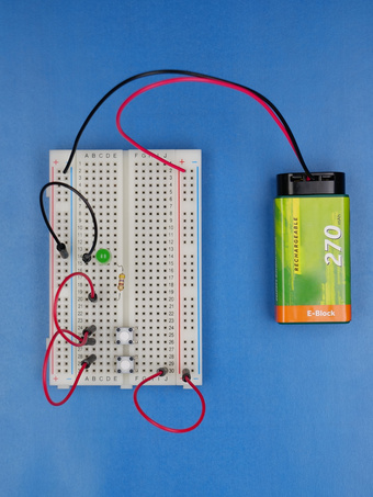 Die Schaltung realisiert eine logische UND-Verknüpfung der Zustände der beiden Taster. Nur wenn beide Taster gleichzeitig gedrückt werden, leuchtet die LED. Es gelten die Nutzungsbedingungen der Mediothek und Pixiothek.
