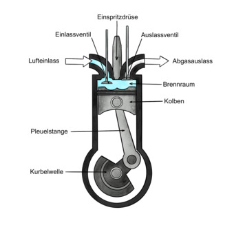 Das Bild gehört zur Serie „Dieselmotor“. Es zeigt den typischen Aufbau eines 4-Takt-Dieselmotors. Bild-Variante: farbig; beschriftet. Es gelten die Nutzungsbedingungen der Mediothek und Pixiothek.