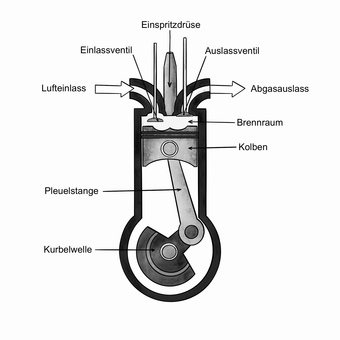 Das Bild gehört zur Serie „Dieselmotor“. Es zeigt den typischen Aufbau eines 4-Takt-Dieselmotors. Bild-Variante: s/w; beschriftet. Es gelten die Nutzungsbedingungen der Mediothek und Pixiothek.
