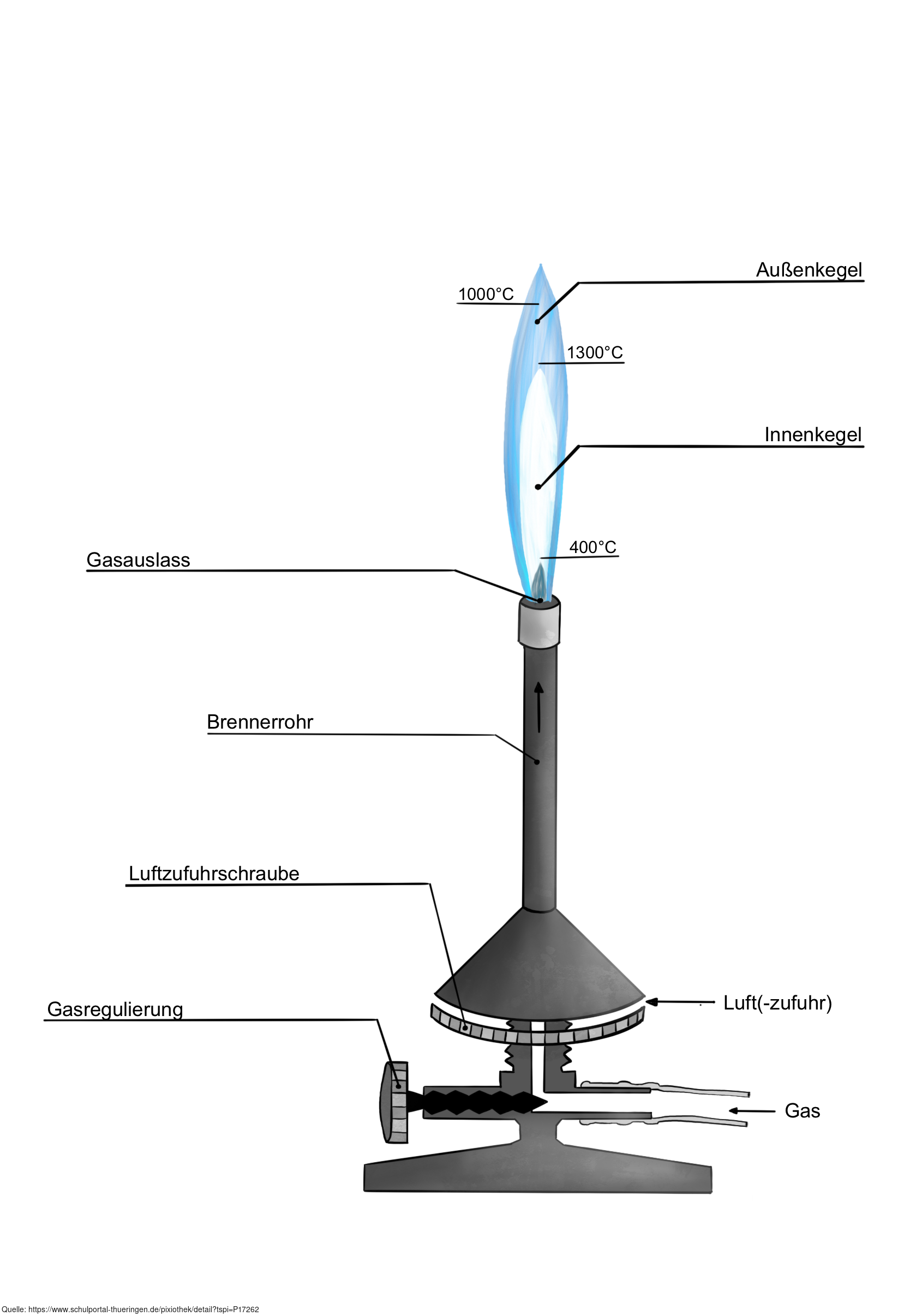 Das Bild verdeutlicht den Aufbau eines Bunsenbrenners. Variante: eine Flamme, farbig; beschriftet. Es gelten die Nutzungsbedingungen der Mediothek und Pixiothek.