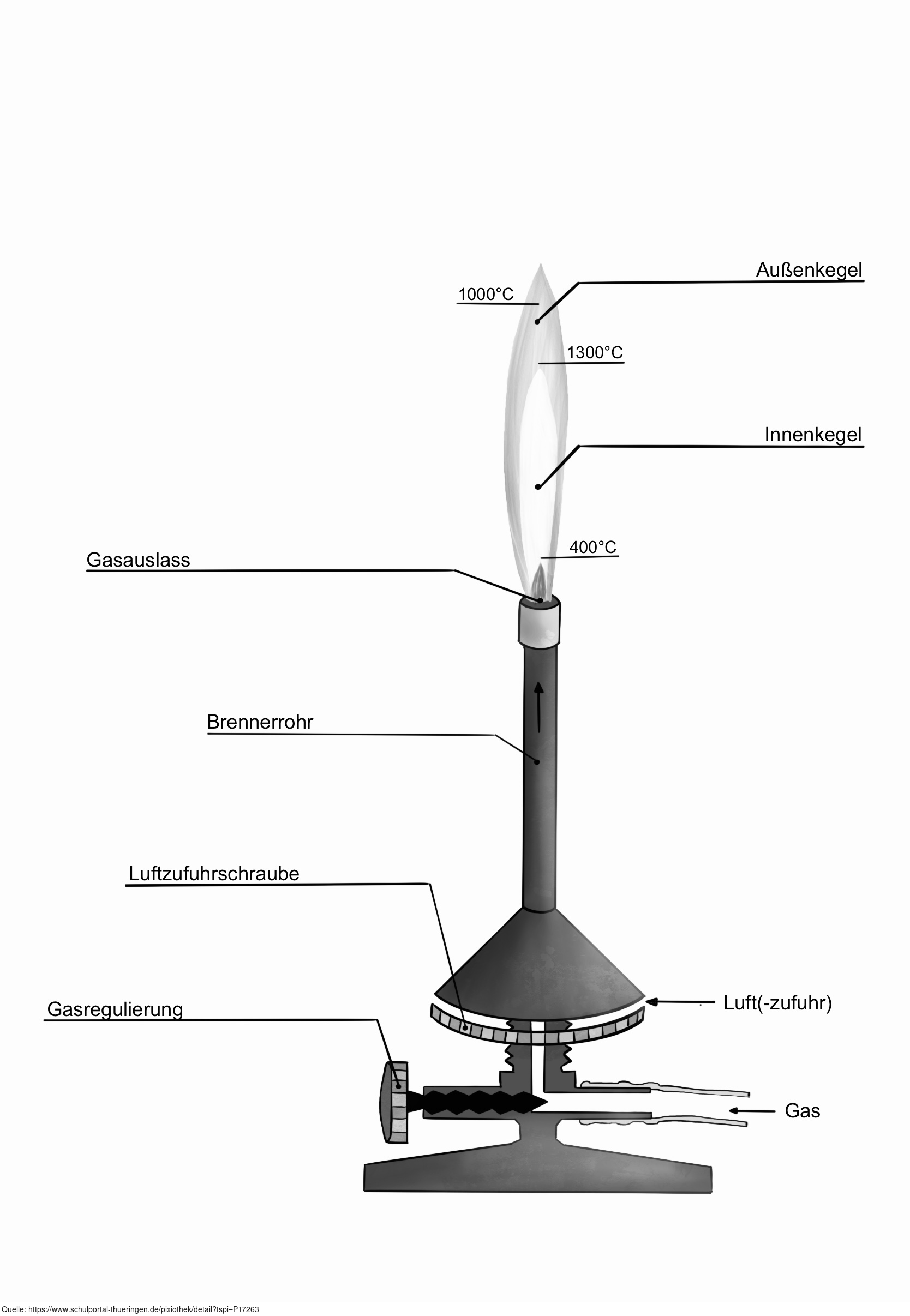 Das Bild verdeutlicht den Aufbau eines Bunsenbrenners. Variante: ein Flamme, s/w; beschriftet. Es gelten die Nutzungsbedingungen der Mediothek und Pixiothek.