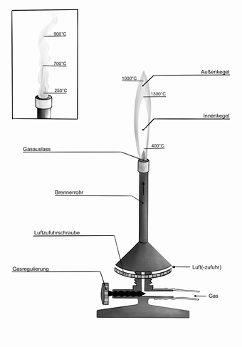 Das Bild verdeutlicht den Aufbau eines Bunsenbrenners. Variante: zwei Flammen, s/w; beschriftet. Es gelten die Nutzungsbedingungen der Mediothek und Pixiothek.
