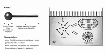 Das Bild verdeutlicht den allgemeinen Aufbau eines Tensids sowie die Mizellenbildung in Wasser. Variante: s/w; beschriftet. Es gelten die Nutzungsbedingungen der Mediothek und Pixiothek.