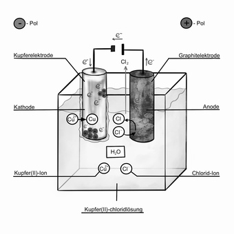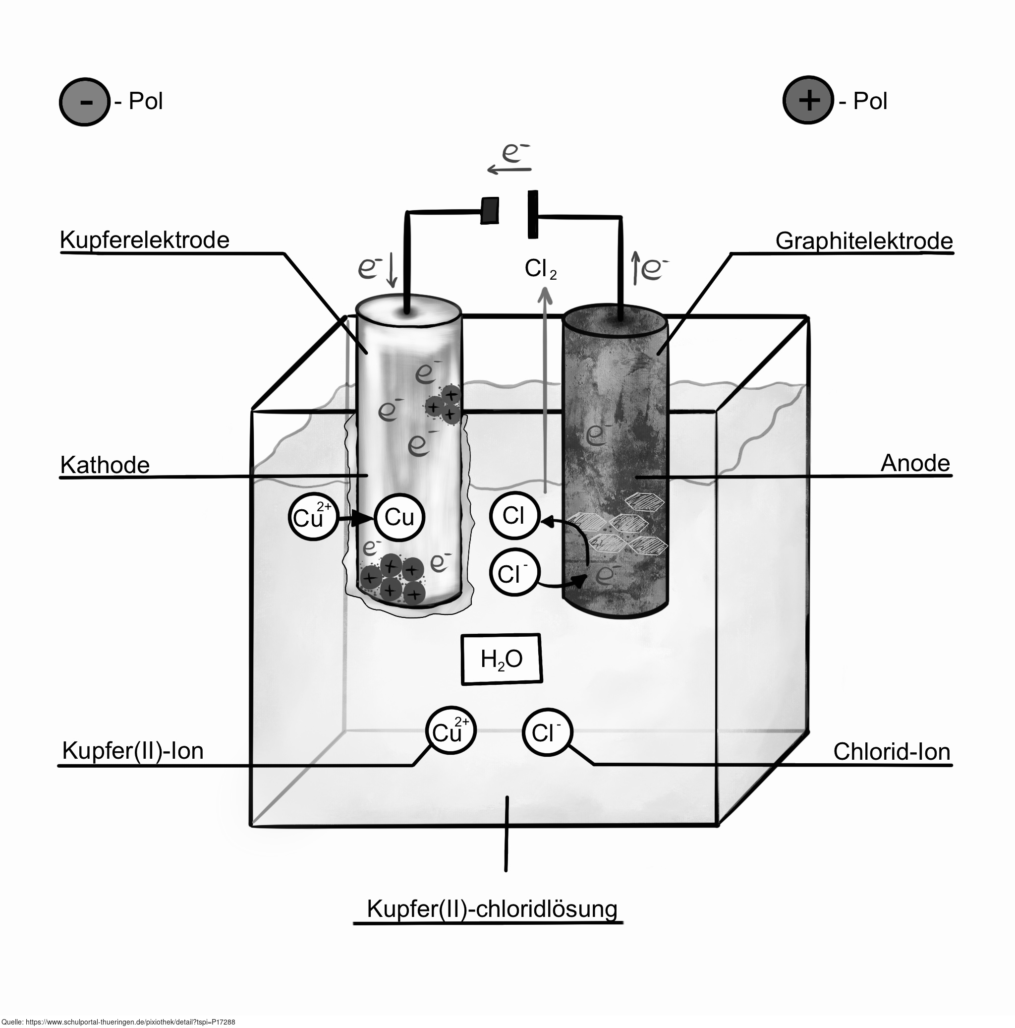 Das Bild gehört zur Serie "Elektrochemie". Es verdeutlicht den Aufbau einer Elektrolyse am Beispiel einer Kupfer(II)-chlorid-Lösung. Bild-Variante: s/w, beschriftet, ohne Erläuterung. Es gelten die Nutzungsbedingungen der Mediothek und Pixiothek.